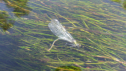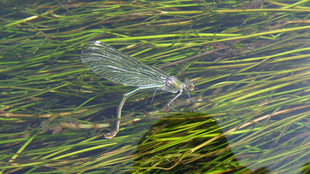 Die gebänderte Prachtlibelle ist ca 5 cm lang und fliegt zwischen Mai und September. Während die Weibchengrün sind, haben die Männchen eine blaue Färbung mit einem blauen Band in den Flügeln. Ihre bevorzugtenPlätze sind sonnige, fließende Gewässer an deren Ufer Schilf oder Seggen zu finden sind. Sie sind territorial. Imrasanten Flug geht es dicht über der Wasseroberfläche hin und her um es abzugrenzen. Von einem Platz möglichst über dem Wasser harren sie gelegentlich aus und schlagen dann und wann ihre Flügel auf. Sie kommenin ganz Europa bis nach Kleinasien und Nordafrika bis in 1200m Höhen vor. Leider sind die Lebensräume heutesehr stark eingeschränkt. Die Paarung verläuft bei der gebänderten Prachtlibelle anders. In den warmen Mittags-stunden findet diese, für wenige Minuten, auf einem Blatt statt. Das Weibchen legt dann anschließend bis zu 300Eier in verschiedene Wasserpflanzen ab. Als ich das Weibchen bei der Eiablage fotografieren konnte hatte ichganz schön kalte Füße bekommen.
